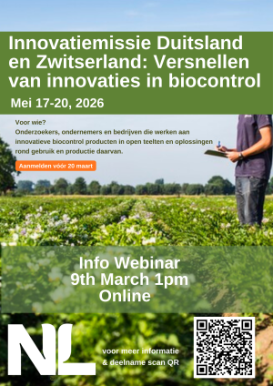 Geplaatst: 24 februari 2026Voorafgaand aan de aanstaande Biocontrol Innovation Mission naar Duitsland en Zwitserland kunnen geinteresseerden in een online webinar meer informatie krijgen.