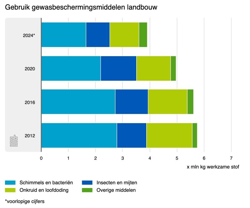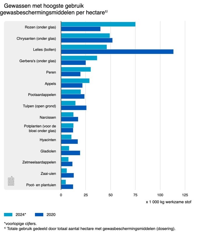 In 2024 gebruikte de landbouw 3,9 miljoen kilogram gewasbeschermingsmiddelen, 22 procent minder dan in 2020. Per hectare gebruikt de landbouw 5,6 kilogram, vier jaar eerder was dat 7,1 kilogram. Om schimmels, onkruid of insecten te bestrijden gebruikt men minder middelen. In de lelieteelt halveerde het bestrijdingsmiddelengebruik ruimschoots. Dit blijkt uit nieuwe cijfers van het Centraal Bureau voor de Statistiek (CBS) over gewasbeschermingsmiddelengebruik bij 44 landbouwgewassen.