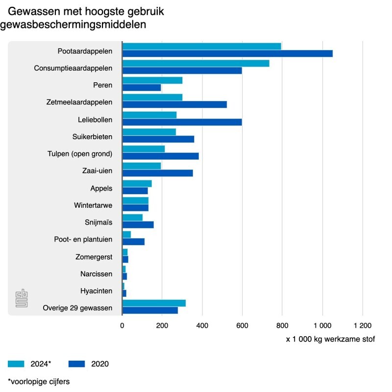 In 2024 gebruikte de landbouw, net als in 2020, meer dan de helft van de gewasbeschermingsmiddelen in de teelt van aardappelen en lelies. Voor de lelieteelt gebruiken bollentelers 273 duizend kilogram middelen, in 2020 was dat 601 duizend kilogram. Lelietelers gebruiken 220 duizend kilogram minder paraffineolie. Het schimmelbestrijdingsmiddel mancozeb is inmiddels verboden; in 2020 gebruikte de lelieteelt daar nog 114 duizend kilogram van. Daardoor is het middelengebruik voor schimmelbestrijding voor lelies 72 procent lager dan in 2020.