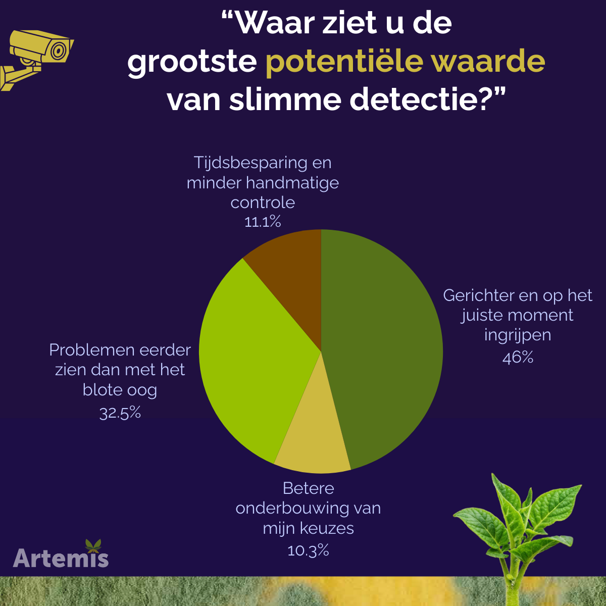 Tijdens het webinar werd via polls ook gevraagd waar deelnemers de grootste waarde van slimme detectie zien. De antwoorden waren duidelijk: de meeste deelnemers verwachten vooral winst in eerder signaleren van problemen en het beter timen van maatregelen. Daarmee wordt detectie gezien als hulpmiddel om gerichter te werken binnen IPM en ICM. Opvallend was dat vrijwel niemand aangaf geen meerwaarde te zien in deze technologie.